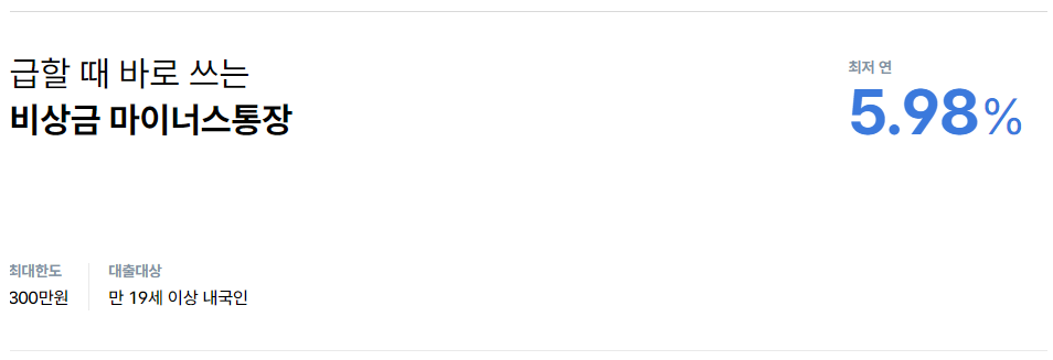 카카오뱅크 비상금은 복잡한 서류 제출이나 지점 방문 없이 카카오뱅크 입출금 통장만 있으면 휴대폰 본인인증 및 신용점수 조회 후 최대 300만원까지 이용할 수 있는 소액 마이너스 상품입니다.