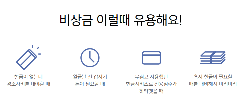 - 현금이 급하게 필요할 때, 갑작스럽게 현금이 부족한 상황에 대비한 상품입니다.