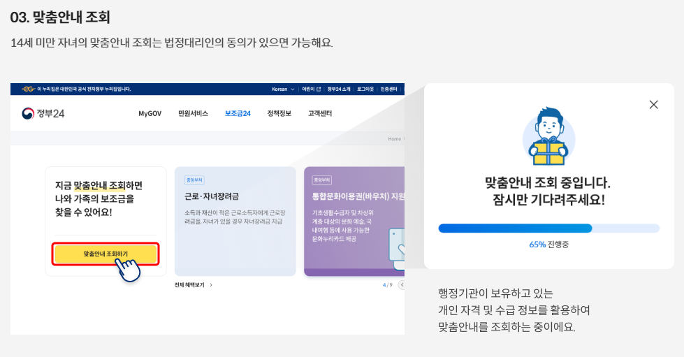 보조금24는 사용자의 개인 정보를 바탕으로 맞춤형 지원금을 추천해줍니다. 이를 통해 사용자는 자신에게 적합한 지원금을 쉽게 찾을 수 있습니다.