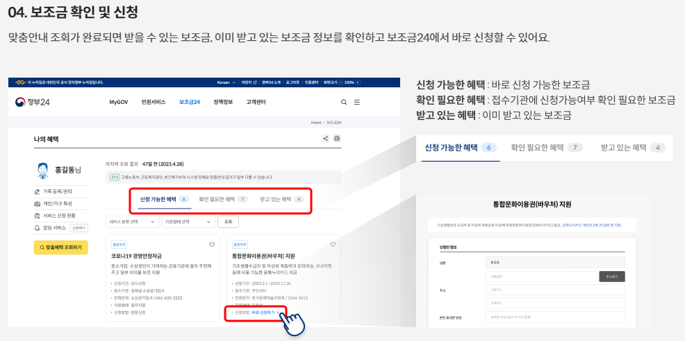 | 4. 신청 현황 확인 | 보조금24에서 신청한 보조금의 진행 상황을 실시간으로 확인할 수 있습니다. |
